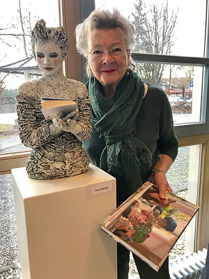 (25. Feb.) Die Gemeindebücherei Wörthsee ist seit dieser Woche um zwei Kunstwerke bereichert worden: Carin Heilmeier, ortsansässige Künstlerin und begeisterte Leserin hat zwei ihrer bezaubernden Frauenbüsten der Gemeindebücherei als Leihgabe vermacht. Dort haben sie einen schönen Platz auf eigens angefertigten Säulen gefunden und verschönern nun das ohnehin bezaubernde Ambiente. Carin Heilmeier ist Keramikerin, Gestalterin, Malerin und Zeremonienmeisterin. In ihrem Künstlerhaus und dem umgebenden Park in Walchstadt sind ihre Figurinen, Büsten, Skulpturen, Zeichnungen und Gemälde zuhause. Die figuralen Arbeiten sind Frauen aus schwerem dunklen Ton. Fein herausgearbeitet die zarten Gesichtszüge, zum Leben erweckt mit kleinen Hilfsmitteln wie Messerchen, Stäbchen, Farben. Es sind sinnliche Frauen, starke Persönlichkeiten, die mit ihren Attributen Lebenshaltung zeigen oder zeitgeistige Erlebnisse vermitteln. Die beiden Figurinen in der Bücherei stellen einen Bezug zum See und zum lesen her: Die eine Frau trägt auf ihrem Kopf einen märchenhaftes Kopfschmuck in blau-grün aus Fischen, püassend zu ihrem blauen Gewand mit elegantem Faltenwurf. Die andere Frau ist am fenster positioniert, ist in schlichten schwarz-weiß Tönen gehalten und hat die Hände in einer buchfreundlichen Haltung verschränkt. Beide Kunstwerke passen ganz wunderbar in die Räumlichkeiten der Bücherei und so mancher Leser steht verliebt-sinnend davor, man möchte sie gerade sanft über die Wange streicheln. Carin Heilmeier hat eine Auswahl ihrer Gemälde und Frauenbüsten bereits auf dem letzten Kulturfest der Gemeinde ausgestellt und dort viel Aufmerksamkeit bekommen. Informationen zur Künstlerin finden sich auf www.carin-heilmeier.de |