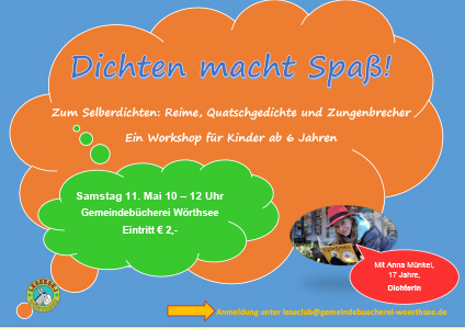Dichten leicht gemacht - Ein Workshop für Kids im Grundschulalter (05. Mai.) Am Samstag 11. Mai 10 - 12 Uhr findet in der Gemeindebücherei ein Gedichte-Workshop für Kids statt. Juliane Seeliger, die die Gemeindebücherei leitet, wird gemeinsam mit der jugendlichen Dichterin Anna Münkel (17 Jahre) aus Die Teilnahme kostet € 2,- und erfordert eine Anmeldug über leseclub@gemeindebuecherei-woerthsee.de |
