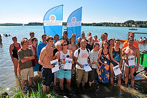 (18. Juli) Bei bestem Sommerwetter beteiligten sich am vergangenen Samstag insgesamt 38 Teilnehmer beim Wörthsee-Schwimmen des örtlichen Rotary Club. Nach der Einschreibung wurden die Teilnehmer zum Startplatz an der Rossschwemme gebracht, von wo aus das Schwimmen im 16 Uhr gestartet wurde. Auf einer von der Wasserwacht hervorragend gesicherten Strecke schwammen bei den Männern Rufus Walk (14’18’’), Christoph Leiser (14’43’’) und Alfred Gödert (15’05’’) Bestzeiten auf der knapp einen Kilometer langen Strecke und sicherten sich die ersten drei Plätze. Bei den Frauen gewann Stefanie Pupeter (15’25’’) vor Hanako Schönberger (17’25’’) und Irena Hofmann (19’12’’). Beim Zieleinlauf wurden die Schwimmer von einem begeisterten Publikum mit großem Applaus begrüßt und Bürgermeister Peter Flach sorgte für die Moderation. Für die ersten drei Plätze hatten das Wörthseer Trendsport-Geschäft „Stuff 4 Freakz“ und die Betreiber des „Il Kiosko“ am Badeplatz Preise gestiftet. Aber auch alle anderen Teilnehmer bekamen als Trostpreis ein kleines Geschenk des Rotary Club, der mit dem Erlös des Schwimmens seine sozialen Projekte unterstützt. Beim anschließenden Fischerstechen gewann Rotarier Claas Hohmann, der das Schwimmen mit initiiert hatte und einen der vorderen Plätze belegt hatte, dann den 2. Platz. Dank der hervorragenden Unterstützung durch den Trachtenverein als Veranstalter des nachfolgenden Seefestes sowie durch die Wasserwacht, das Rote Kreuz und die Gemeinde Wörthsee plant der Rotary Club eine Wiederholung des Schwimm-Events im kommenden Jahr. |