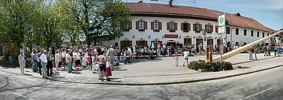 Während am Maibaum in luftiger Höhe noch Kränze und Tafeln angebracht wurden, lief im Biergarten schon die Versteigerung von Wurst- und Fleischwaren zugunsten der Burschenschaft