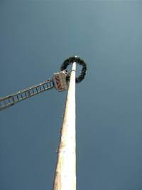 Noch wartet der 35m lange Baum des Jahrganges 2001 auf seinen großen Auftritt. Der Baum mit einem Stammdurchmesser von 48 cm und einem Gewicht von fast 3 Tonnen wurde 108 Jahre alt, bevor er seinen Verwendungszweck